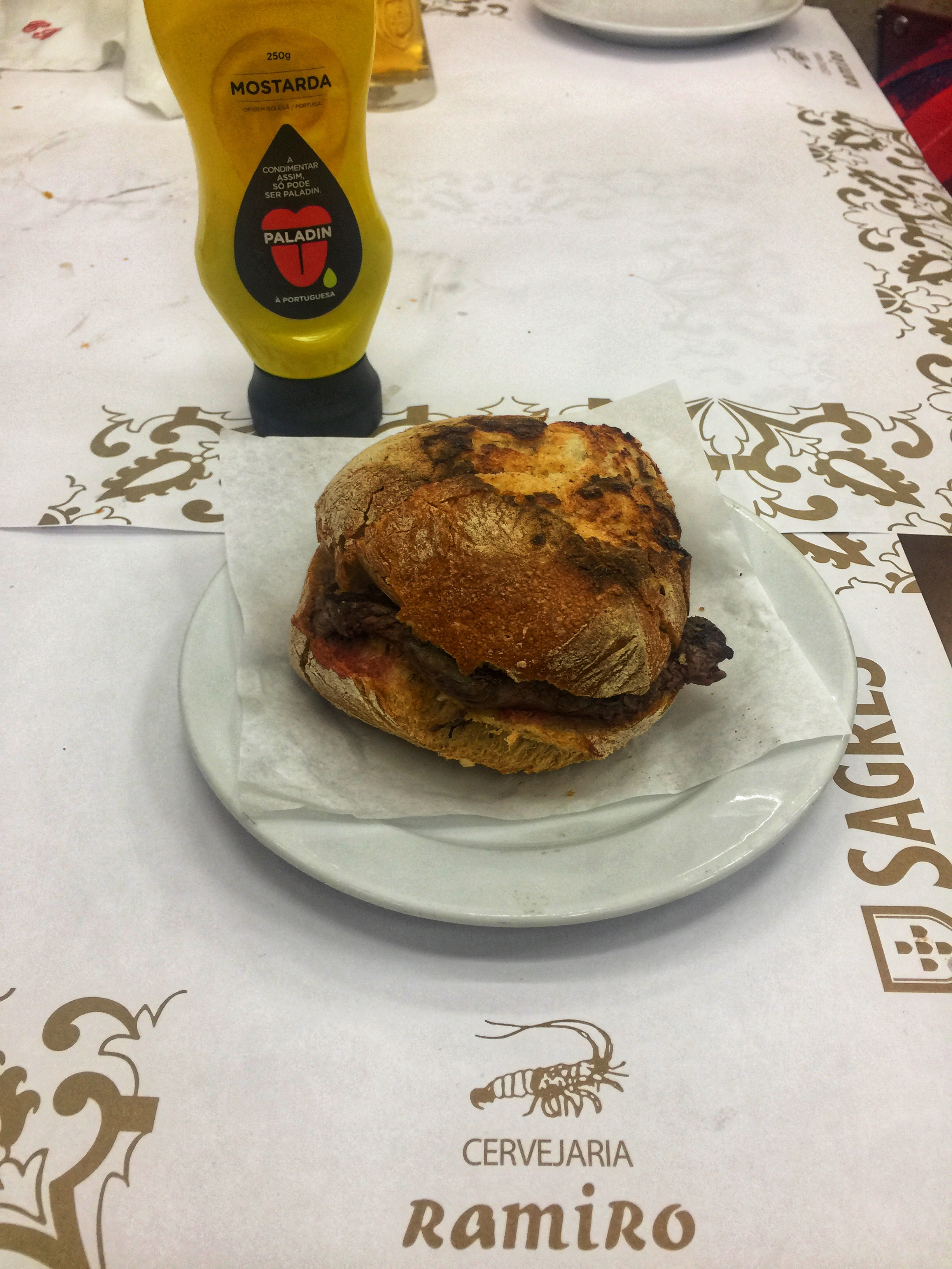 Bu restoranın bir de ritüeli var. Şöyle ki, Ramiro’da yemeğin üstüne tatlı niyetine “prego” yeniliyor, peki nedir bu prego? Aşağıdaki fotoda gördüğünüz gibi bol sarımsak ile pişirilmiş biftekli sandviç!! Ne alaka dediğinizi duyar gibiyim ama sebebi bu kadar deniz mahsulünün üzerine et iyi gidermiş, gerçekten de iyi gidiyor, deneyin! Ayhan Sicimoğlu’nun deyimiyle bu mekanın “hastasıyız”.